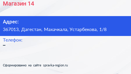 Магазин №14 по адресу 367013, Дагестан, Махачкала, Устарбекова, 1/8 в дальнейшем Организация, размещена в следующих категориях: