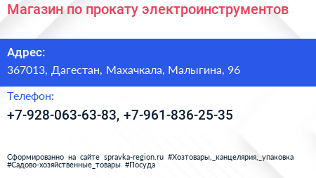 Магазин по прокату электроинструментов по адресу 367013, Дагестан, Махачкала, Малыгина, 96 в дальнейшем Организация, размещена в следующих категориях: