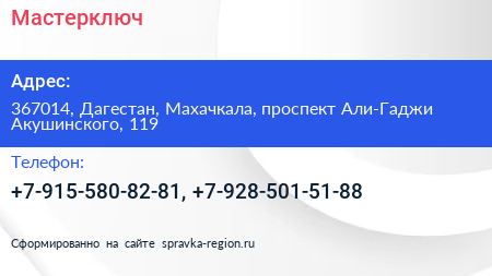 Мастерключ по адресу 367014, Дагестан, Махачкала, проспект Али-Гаджи Акушинского, 119 в дальнейшем Организация, размещена в следующих категориях:
