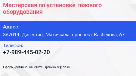 Мастерская по установке газового оборудования по адресу 367014, Дагестан, Махачкала, проспект Казбекова, 67 в дальнейшем Организация, размещена в следующих категориях:
