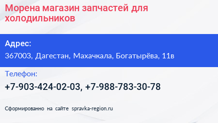 Морена, магазин запчастей для холодильников по адресу 367003, Дагестан, Махачкала, Богатырёва, 11в в дальнейшем Организация, размещена в следующих категориях: