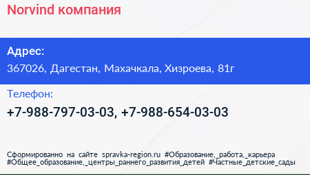 Norvind, компания по адресу 367026, Дагестан, Махачкала, Хизроева, 81г в дальнейшем Организация, размещена в следующих категориях: