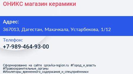 ОНИКС, магазин керамики по адресу 367013, Дагестан, Махачкала, Устарбекова, 1/12 в дальнейшем Организация, размещена в следующих категориях: