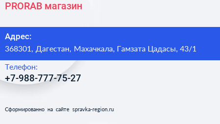 PRORAB, магазин по адресу 368301, Дагестан, Махачкала, Гамзата Цадасы, 43/1 в дальнейшем Организация, размещена в следующих категориях: