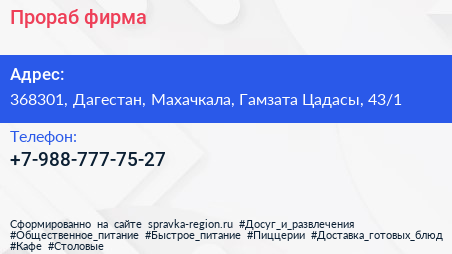 Прораб, фирма по адресу 368301, Дагестан, Махачкала, Гамзата Цадасы, 43/1 в дальнейшем Организация, размещена в следующих категориях:
