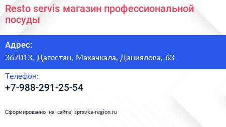 Resto-servis, магазин профессиональной посуды по адресу 367013, Дагестан, Махачкала, Даниялова, 63 в дальнейшем Организация, размещена в следующих категориях: