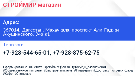 СТРОЙМИР, магазин по адресу 367014, Дагестан, Махачкала, проспект Али-Гаджи Акушинского, 94а к1 в дальнейшем Организация, размещена в следующих категориях: