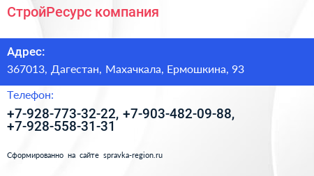 СтройРесурс, компания по адресу 367013, Дагестан, Махачкала, Ермошкина, 93 в дальнейшем Организация, размещена в следующих категориях: