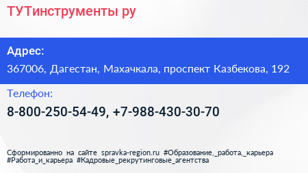 ТУТинструменты.ру по адресу 367006, Дагестан, Махачкала, проспект Казбекова, 192 в дальнейшем Организация, размещена в следующих категориях: