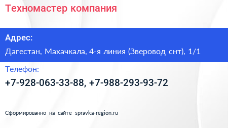 Техномастер, компания по адресу Дагестан, Махачкала, 4-я линия (Зверовод снт), 1/1 в дальнейшем Организация, размещена в следующих категориях: