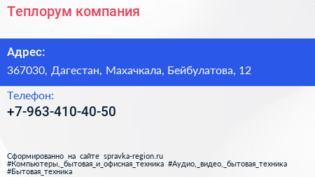 Теплорум, компания по адресу 367030, Дагестан, Махачкала, Бейбулатова, 12 в дальнейшем Организация, размещена в следующих категориях: