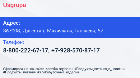 Usgrupa по адресу 367008, Дагестан, Махачкала, Танкаева, 57 в дальнейшем Организация, размещена в следующих категориях: