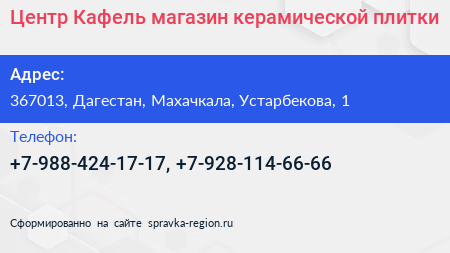 Центр Кафель, магазин керамической плитки по адресу 367013, Дагестан, Махачкала, Устарбекова, 1 в дальнейшем Организация, размещена в следующих категориях:
