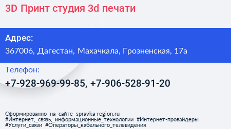 3D Принт, студия 3d печати по адресу 367006, Дагестан, Махачкала, Грозненская, 17а в дальнейшем Организация, размещена в следующих категориях: