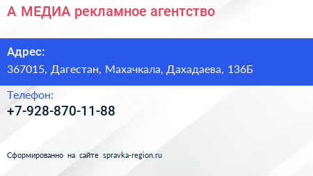А-МЕДИА, рекламное агентство по адресу 367015, Дагестан, Махачкала, Дахадаева, 136Б в дальнейшем Организация, размещена в следующих категориях: