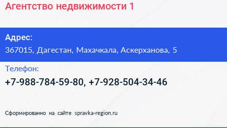 Агентство недвижимости №1 по адресу 367015, Дагестан, Махачкала, Аскерханова, 5 в дальнейшем Организация, размещена в следующих категориях: