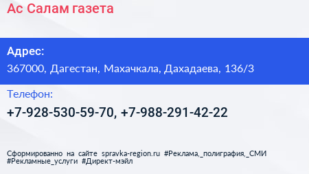 Ас-Салам, газета по адресу 367000, Дагестан, Махачкала, Дахадаева, 136/3 в дальнейшем Организация, размещена в следующих категориях: