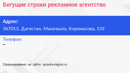 Бегущие строки, рекламное агентство по адресу 367013, Дагестан, Махачкала, Коркмасова, 133 в дальнейшем Организация, размещена в следующих категориях: