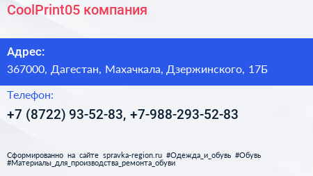 CoolPrint05, компания по адресу 367000, Дагестан, Махачкала, Дзержинского, 17Б в дальнейшем Организация, размещена в следующих категориях: