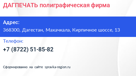ДАГПЕЧАТЬ, полиграфическая фирма по адресу 368300, Дагестан, Махачкала, Кирпичное шоссе, 13 в дальнейшем Организация, размещена в следующих категориях: