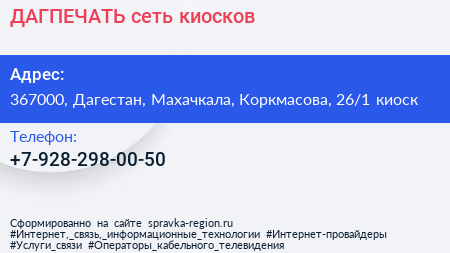 ДАГПЕЧАТЬ, сеть киосков по адресу 367000, Дагестан, Махачкала, Коркмасова, 26/1 киоск в дальнейшем Организация, размещена в следующих категориях: