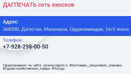 ДАГПЕЧАТЬ, сеть киосков по адресу 368300, Дагестан, Махачкала, Орджоникидзе, 16/2 киоск в дальнейшем Организация, размещена в следующих категориях: