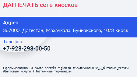 ДАГПЕЧАТЬ, сеть киосков по адресу 367000, Дагестан, Махачкала, Буйнакского, 10/3 киоск в дальнейшем Организация, размещена в следующих категориях: