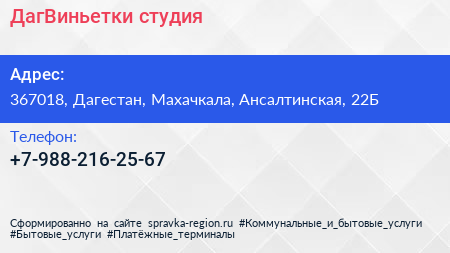ДагВиньетки, студия по адресу 367018, Дагестан, Махачкала, Ансалтинская, 22Б в дальнейшем Организация, размещена в следующих категориях: