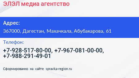 ЭЛЭЛ медиа, агентство по адресу 367000, Дагестан, Махачкала, Абубакарова, 61 в дальнейшем Организация, размещена в следующих категориях: