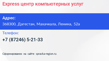 Express, центр компьютерных услуг по адресу 368300, Дагестан, Махачкала, Ленина, 52а в дальнейшем Организация, размещена в следующих категориях: