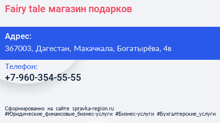 Fairy tale, магазин подарков по адресу 367003, Дагестан, Махачкала, Богатырёва, 4в в дальнейшем Организация, размещена в следующих категориях: