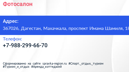 Фотосалон по адресу 367026, Дагестан, Махачкала, проспект Имама Шамиля, 18 в дальнейшем Организация, размещена в следующих категориях: