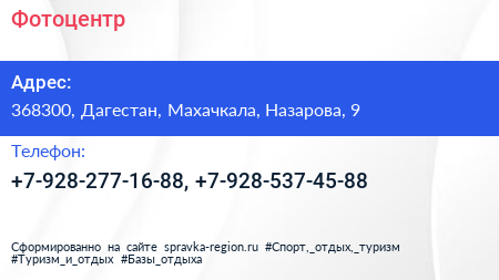Фотоцентр по адресу 368300, Дагестан, Махачкала, Назарова, 9 в дальнейшем Организация, размещена в следующих категориях: