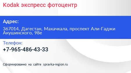 Kodak экспресс, фотоцентр по адресу 367014, Дагестан, Махачкала, проспект Али-Гаджи Акушинского, 98е в дальнейшем Организация, размещена в следующих категориях: