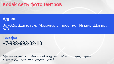 Kodak, сеть фотоцентров по адресу 367026, Дагестан, Махачкала, проспект Имама Шамиля, 6/3 в дальнейшем Организация, размещена в следующих категориях: