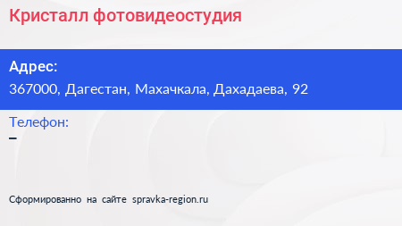 Кристалл, фотовидеостудия по адресу 367000, Дагестан, Махачкала, Дахадаева, 92 в дальнейшем Организация, размещена в следующих категориях: