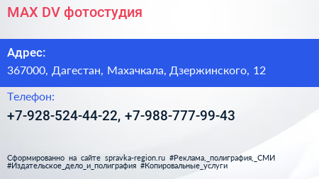 MAX-DV, фотостудия по адресу 367000, Дагестан, Махачкала, Дзержинского, 12 в дальнейшем Организация, размещена в следующих категориях: