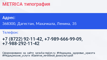 METRICA, типография по адресу 368300, Дагестан, Махачкала, Ленина, 35 в дальнейшем Организация, размещена в следующих категориях:
