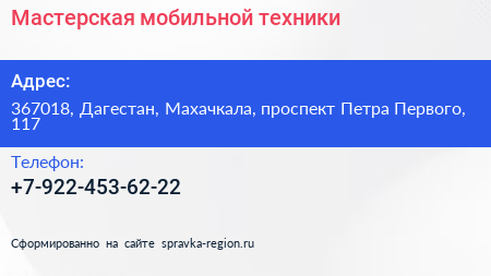 Мастерская мобильной техники по адресу 367018, Дагестан, Махачкала, проспект Петра Первого, 117 в дальнейшем Организация, размещена в следующих категориях: