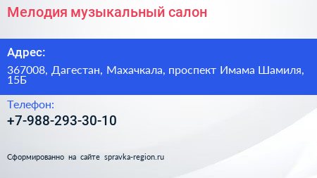 Мелодия, музыкальный салон по адресу 367008, Дагестан, Махачкала, проспект Имама Шамиля, 15Б в дальнейшем Организация, размещена в следующих категориях: