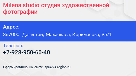 Milena studio, студия художественной фотографии по адресу 367000, Дагестан, Махачкала, Коркмасова, 95/1 в дальнейшем Организация, размещена в следующих категориях: