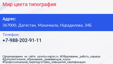 Мир цвета, типография по адресу 367000, Дагестан, Махачкала, Нурадилова, 34Б в дальнейшем Организация, размещена в следующих категориях: