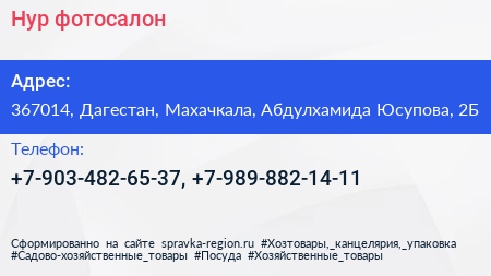 Нур, фотосалон по адресу 367014, Дагестан, Махачкала, Абдулхамида Юсупова, 2Б в дальнейшем Организация, размещена в следующих категориях:
