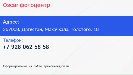 Oscar, фотоцентр по адресу 367008, Дагестан, Махачкала, Толстого, 18 в дальнейшем Организация, размещена в следующих категориях: