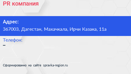 PR, компания по адресу 367003, Дагестан, Махачкала, Ирчи Казака, 11а в дальнейшем Организация, размещена в следующих категориях: