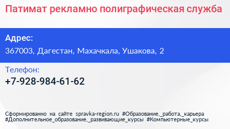 Патимат, рекламно-полиграфическая служба по адресу 367003, Дагестан, Махачкала, Ушакова, 2 в дальнейшем Организация, размещена в следующих категориях: