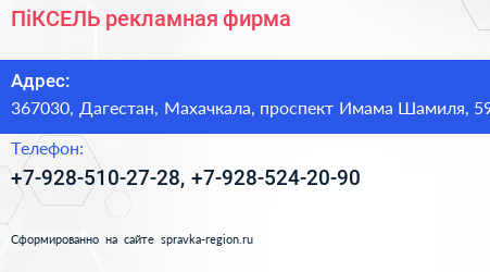 ПiКСЕЛЬ, рекламная фирма по адресу 367030, Дагестан, Махачкала, проспект Имама Шамиля, 59 в дальнейшем Организация, размещена в следующих категориях: