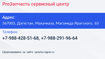 ProЗапчасть, сервисный центр по адресу 367003, Дагестан, Махачкала, Магомеда Ярагского, 63 в дальнейшем Организация, размещена в следующих категориях: