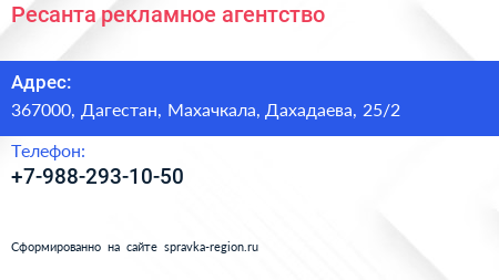 Ресанта, рекламное агентство по адресу 367000, Дагестан, Махачкала, Дахадаева, 25/2 в дальнейшем Организация, размещена в следующих категориях: