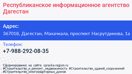 Республиканское информационное агентство Дагестан по адресу 367018, Дагестан, Махачкала, проспект Насрутдинова, 1а в дальнейшем Организация, размещена в следующих категориях:
